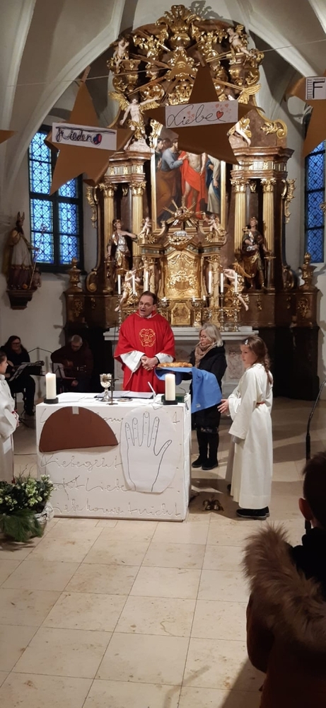 Im Anschluss an die Workshops feierte Vikar Mag. Hatzmann mit uns die Heilige Messe. Nach dem Hören der Heiligen Schrift besprachen wir die Symbole Brot und Hand.